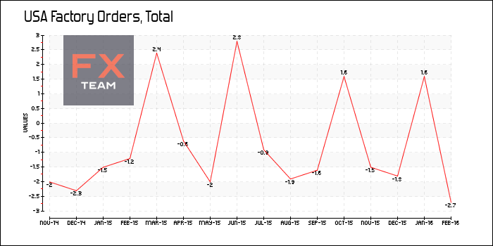Объем производственных заказов США сократился на 1,7% за февраль 2016 г. после увеличения на 1,2% в предыдущем месяце, сообщает Министерство торговли. Аналитики прогнозировали снижение показателя на 1,5%.