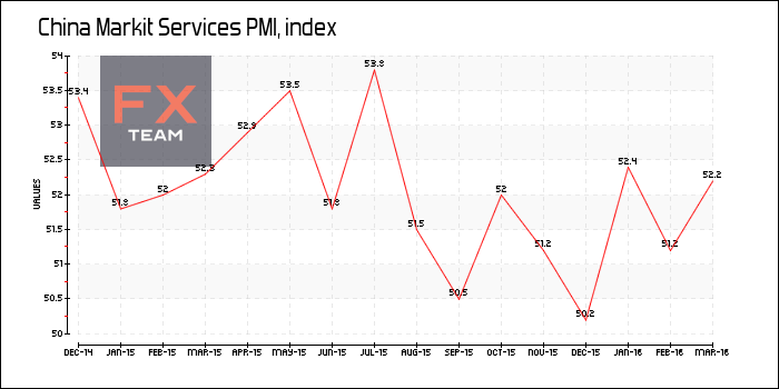 Индекс деловой активности в сфере услуг (Caixin China General Services Business Activity Index) повысился до 52,2 пункта в марте с 51,2 пункта в феврале, отражая более высокие показатели в этом секторе. Значение индекса превысило прогнозируемый уровень 51,4 пункта.