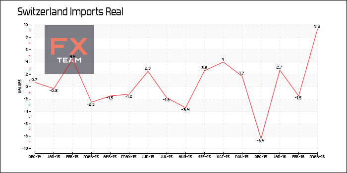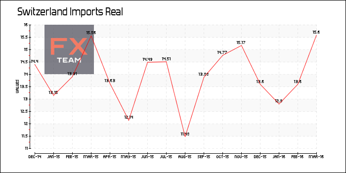 Физический объем импорта вырос на 9,3% за март до 15,6 млрд. швейцарских франков по сравнению с 13,6 млрд. в предыдущем месяце.