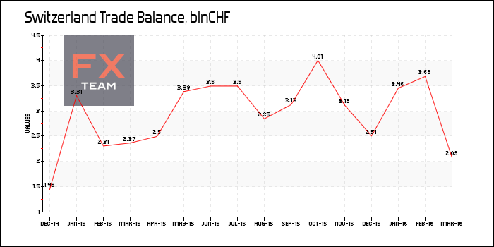 Профицит баланса внешней торговли Швейцарии снизился до 2,16 млрд. швейцарских франков за март 2016 г. по сравнению с 4,02 млрд. в предыдущем месяце, ввиду сокращения объемов экспорта и роста объемов импорта, сообщает Таможенное управление Швейцарии. Аналитики прогнозировали профицит на уровне 3,89 млрд. швейцарских франков.