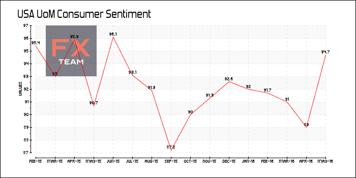 По предварительным данным Мичиганского университета, индекс настроений потребителей повысился до отметки 95,8 в мае по сравнению с 89,0 в апреле. Таким образом, данный показатель оказался на самом высоком уровне с июня 2015 года.