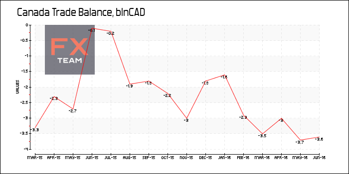 Дефицит баланса внешней торговли Канады составил 3,6 млрд. долларов за июнь 2016 г. по сравнению с 3,5 млрд. долларов в предыдущем месяце, сообщает Статистическое управление. При этом аналитики прогнозировали снижение дефицита до 2,6 млрд. долларов.