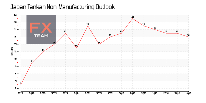 Прогнозное значение индекса Tankan для непроизводственной сферы снизилось с 17 пунктов в третьем квартале до 16 пунктов в четвертом квартале.