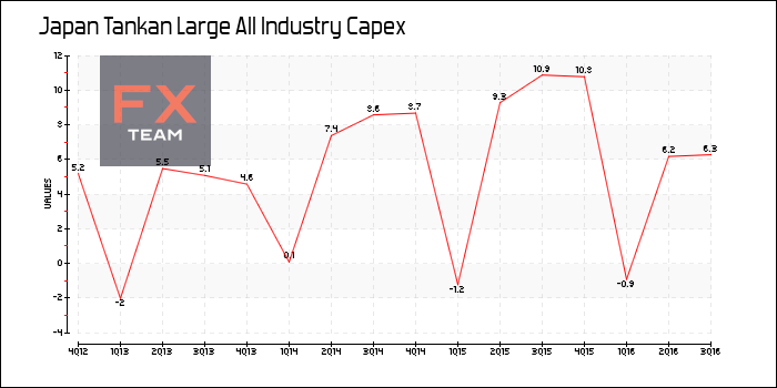 Индекс Tankan для капитальных расходов крупных предприятий всех отраслей повысился до 6,3% во втором квартале по сравнению с 6,2% в предыдущем квартале, при прогнозе роста до 6,4%.