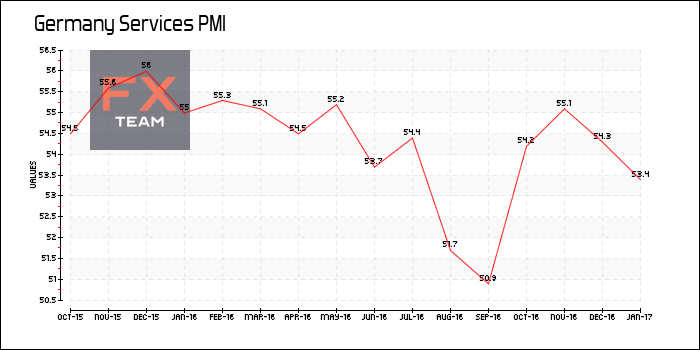 Деловая активность в секторе услуг, напротив, снизилась по сравнению с предыдущим месяцем. Индекс деловой активности в секторе услуг составил 53,2 пункта в январе против 54,3 пункта в декабре, при прогнозе повышения до 54,6 пункта.