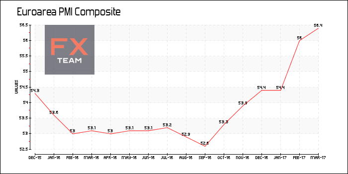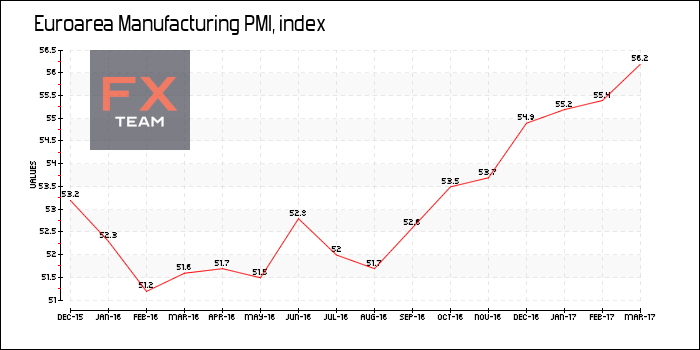По предварительной оценке IHSMarkit, индекс деловой активности в производственном секторе еврозоны (ManufacturingPMI) составил 56,2 пункта в марте 2017 г. по сравнению с 55,4 пункта в предыдущем месяце. Показатель достиг самого высокого значения за 71 месяц и превысил прогнозируемый уровень 55,3 пункта.