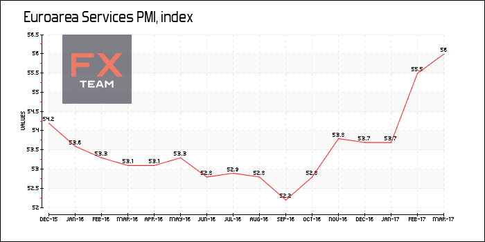 Индекс деловой активности в секторе услуг (Services PMI) еврозоны повысился до 56,5 пункта в марте с 55,5 пункта в феврале, при прогнозе снижения к отметке 55,4 пункта. Это максимальное значение показателя за 71 месяц.