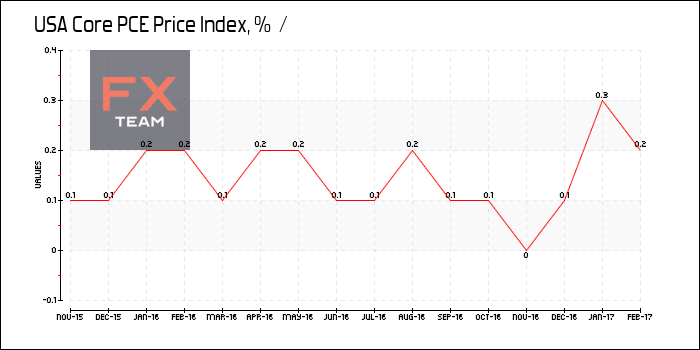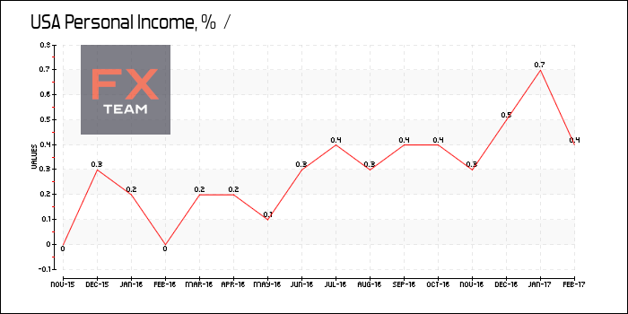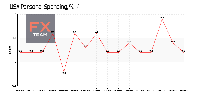 Согласно оценке Бюро экономического анализа, уровень расходов населения США повысился на 0,1% за февраль 2017 г. в месячном исчислении после увеличения на 0,2% в предыдущем месяце. Ожидался рост индекса на 0,2%.