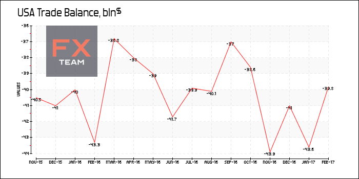 По данным Бюро переписи США, дефицит баланса внешней торговли составил 43,6 млрд. долларов в феврале 2017 г. по сравнению с 48,2 млрд. долларов в предыдущем месяце. Аналитики прогнозировали снижение дефицита до 46,0 млрд. долларов.