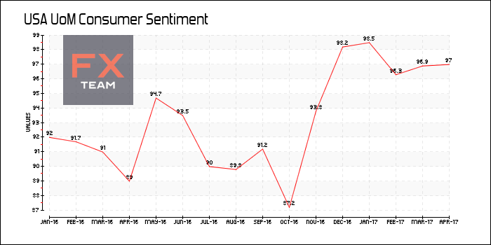 По данным университета Мичигана, индекс настроения потребителей составил 98,0 пункта в апреле 2017 г. по сравнению с 96,9 пункта в марте, превысив ожидаемый уровень 97,1 пункта. Показатель вырос, в основном, в результате более высокой оценки текущих экономических условий.