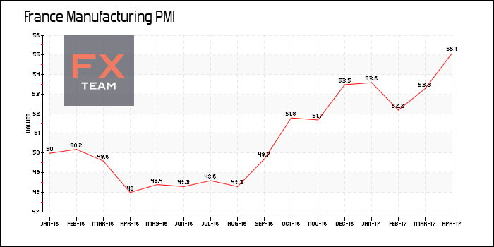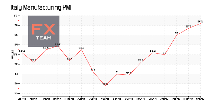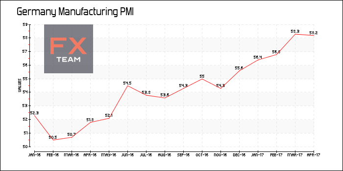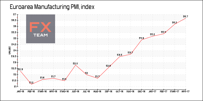Согласно окончательной оценке IHSMarkit, индекс деловой активности в производственном секторе еврозоны (ManufacturingPMI) составил 56,7 пункта в апреле 2017 г. по сравнению с 56,2 пункта в марте. По сравнению с предварительной оценкой значение PMI было пересмотрено в меньшую сторону всего на один пункт (с 56,8 пункта).