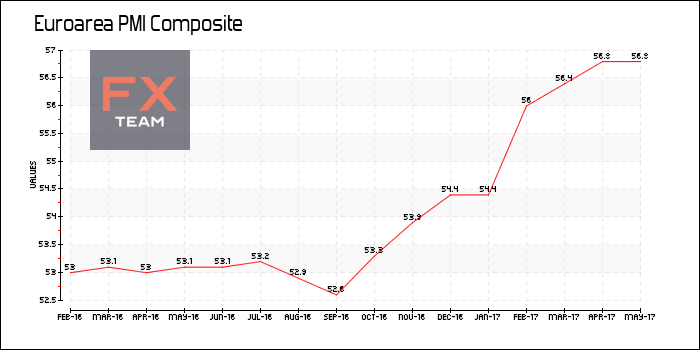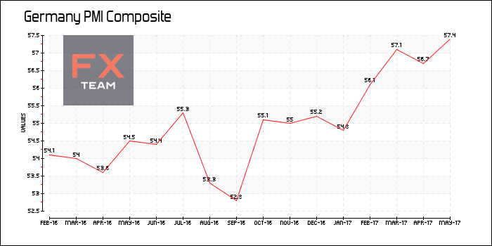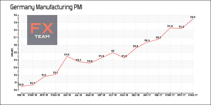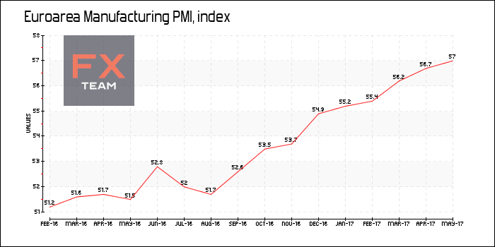 По предварительным данным Markit Economics, индекс деловой активности в производственном секторе (PMI manufacturing) еврозоны составил 57,0 пункта в мае по сравнению с 56,7 пункта в апреле. Темпы роста активности увеличились до самого высокого уровня больше чем за шестилетний период. При этом прогнозировалось снижение индекса до 56,5 пункта.