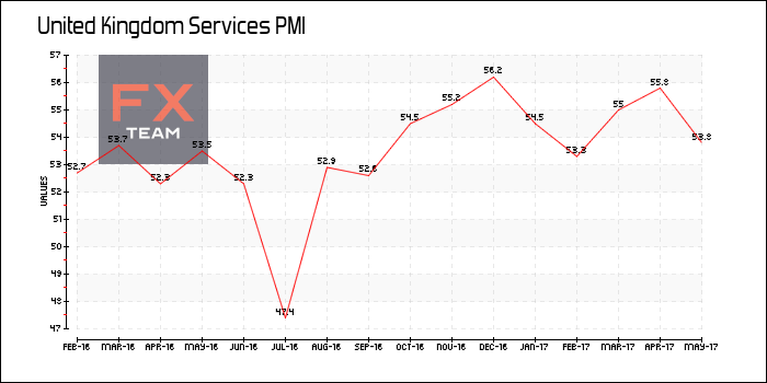 По данным Markit Economics, индекс PMI, отражающий динамику активности в сфере услуг Великобритании, составил 53,8 пункта в мае по сравнению с 55,8 пункта в предыдущем месяце. Прогнозировалось снижение индекса до 55,1 пункта.