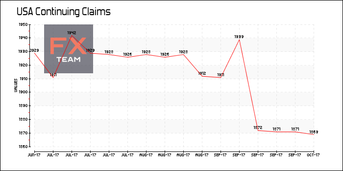 Число повторных заявок на получение пособия по безработице за неделю к 7 октября снизилось на 16 000 до 1 888 000, при прогнозе 1 900 000. Предыдущее значение было пересмотрено в большую сторону на 15 000, с 1 889 000 до 1 904 000.