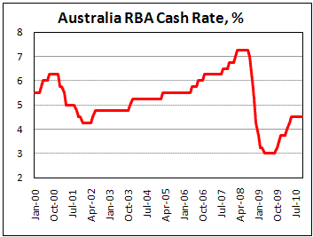 На заседании во вторник, 5 октября, Комитет по кредитно-денежной политике Резервного Банка Австралии сохранил ключевую процентную ставку на уровне 4,50%. Большинством аналитиков ожидалось повышение ставки на 25 базисных пунктов.