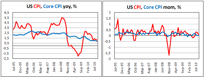 В годовом исчислении индекс потребительских цен США не изменился за сентябрь, составив 1,1% при прогнозе 1,2%.