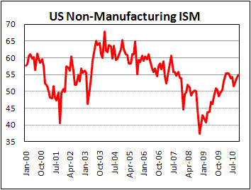 Индекс ISM для непроизводственной сферы возрос в ноябре до отметки 55% после 54,3% в октябре. Экономисты прогнозировали повышение показателя до 55%.