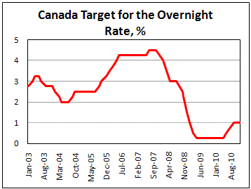 Восстановление экономики Канады продолжается умеренными темпами, хотя экономическая активность во второй половине 2010 года оказалась несколько слабее прогнозов, которые были указаны Банком Канады в октябрьском докладе о монетарной политике. В третьем квартале рост расходов домохозяйств превысил ожидавшийся уровень. Также значительным оказался рост деловых инвестиций. Тем не менее, объемы экспорта оказались ниже прогнозов, что продолжает оказывать давление на общий экономический рост.
