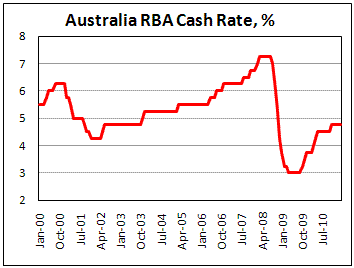 Как и ожидалось, Резервный Банк Австралии принял решение оставить основную процентную ставку на уровне 4,75%. Банк ожидает, что темпы инфляции снизятся до целевой отметки в течение 2011 года.
