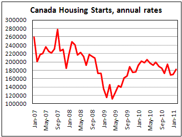 Строительство новых домов повысилось в феврале с учетом сезонных колебаний до 181,9 тыс. ед. по сравнению с 170,6 тыс. ед. в январе. Отметим, что январское значение показателя было скорректировано в сторону небольшого повышения по сравнению с первоначальным значением 170,4 тыс. ед.