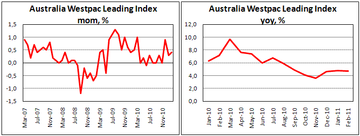 Индекс ведущих экономических индикаторов Австралии от Westpac-Melbourne, на основе которого прогнозируется экономическая активность в течение ближайших 3-9 месяцев, вырос в феврале на 1,0 пункт, или 0,4%, до 282,2 пункта.