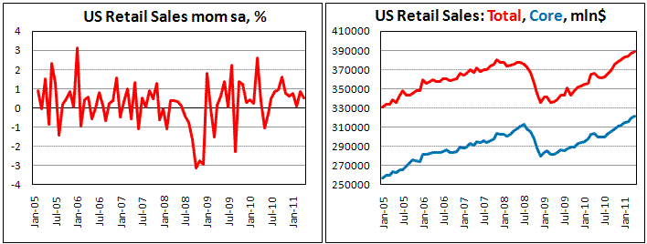 - Объемы розничной торговли в США увеличились на 0,5% за апрель