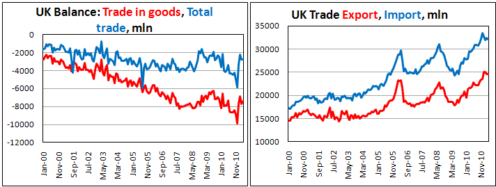 По данным Национального статистического управления, отрицательное сальдо баланса видимой торговли Великобритании составило £7,389 млрд. за апрель по сравнению с дефицитом в размере £7,708 млрд. месяцем ранее. Аналитики прогнозировали снижение дефицита до £7,549 млрд.