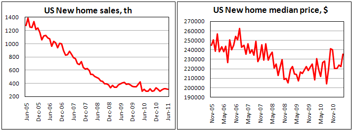 По данным Бюро переписи и Министерства жилищного строительства и городского развития, объем продаж на первичном рынке жилья составил 312 000 за июнь, на 1,0% меньше по сравнению с майским значением 315 000.