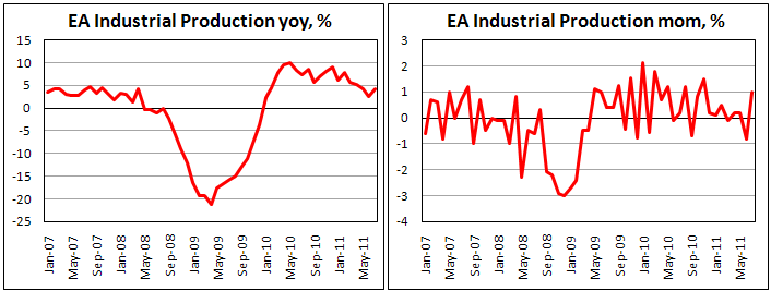 В годовом исчислении объем промышленного производства еврозоны увеличился на 4,2% в июле при предыдущем значении 2,6% и прогнозе 4,6%.