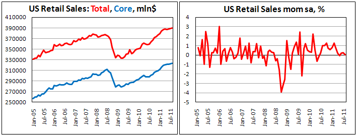 По данным Министерства торговли США, розничные продажи составили 389,5 млрд. в августе. При этом показатель продемонстрировал худшую динамику с мая текущего года. Розничные продажи без учета продаж в автомобильном секторе повысились на 0,1%.