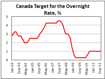 Во вторник Банк Канады объявил о своем решении оставить ключевую процентную ставку на отметке 1%, отметив при этом, что слабые темпы экономического роста в США и краткосрочная рецессия в Европе окажут негативное давление на национальную экономику.