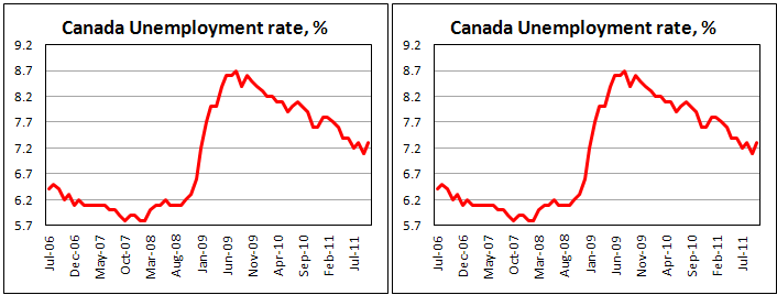 После повышения в сентябре занятость в Канаде снизилась на 54 тыс. в октябре. В результате, уровень безработицы повысился на 0,2% до 7,3%.