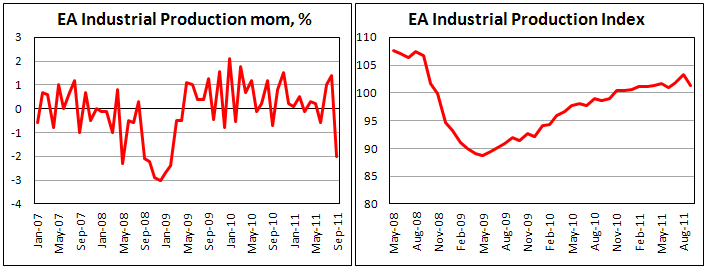 В годовом исчислении объем промышленного производства еврозоны увеличился на 2,2% в сентябре при предыдущем значении 6,0% и прогнозе 3,6%.