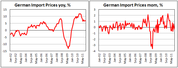По данным Федерального агентства статистики Германии, годовые темы роста цен на импорт в Германии замедлились до 6,8% в октябре.