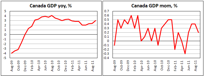 По данным Статистического управления Канады, ВВП увеличился на 0,2% за сентябрь 2011 г. в месячном исчислении. Аналитики прогнозировали повышение показателя на 0,3%. В предыдущем месяце индекс вырос на 0,4%.