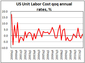 В то же время, себестоимость труда возросла на 1,2% в отчетном периоде по сравнению с падением на 2,1% в третьем квартале.