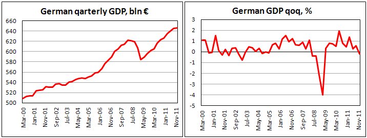 По данным Федерального статистического управления, с учетом сезонных факторов ВВП Германии снизился на 0,2% за 4 квартал 2011 г.