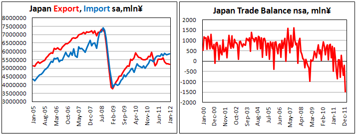 Дефицит внешней торговли Японии повысился до рекордно высокого уровня в январе. Сильная йена отрицательно повлияла на японский экспорт, а объемы импортируемых энергоносителей значительно увеличились в связи с кризисом в сфере атомной энергетики.