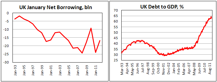Чистый государственный долг Великобритании в конце января составил 988,7 млрд. фунтов, или 63% от ВВП. В январе 2011 года данный показатель находился на отметке 869,1 млрд. фунтов.