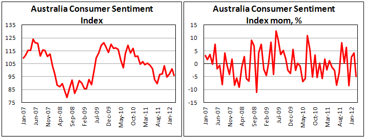 Индекс потребительской уверенности, рассчитанный Westpac Melbourne Institute, снизился на 5,0% за март 2012 г., с 101,1 пункта до 96,1 пункта. В годовом исчислении показатель снизился на 7,7% (104,1 пункта в марте 2011 г.).