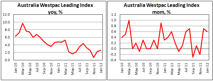 "Индекс ведущих индикаторов продолжает демонстрировать слабые темпы роста экономики Австралии, - отметил старший экономист Westpac Мэтью Хассан. - Ситуация улучшилась по сравнению с низкими показателями в четвертом квартале, однако индекс продолжает указывать на слабый экономический рост, который в лучшем случае будет наблюдаться в начале 2012 года”.