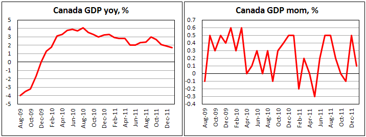 По данным Статистического управления Канады, ВВП увеличился на 0,1% за январь 2012 г. в месячном исчислении. Значение показателя соответствует прогнозам аналитиков. В предыдущем месяце индекс повысился на 0,5%.