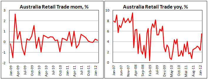 Объем розничной торговли в Австралии увеличился на 0,2% за февраль 2012 г. в месячном исчислении, сообщает Статистическое управление страны.