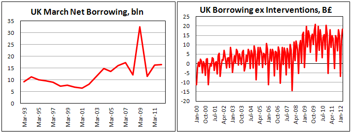Чистый объем заемных средств государственного сектора с учетом финансовых интервенций возрос до 15,9 млрд. фунтов в марте по сравнению с 9,9 млрд. фунтов в феврале. Эксперты прогнозировали, что данный показатель окажется на отметке 14,2 млрд. фунтов.
