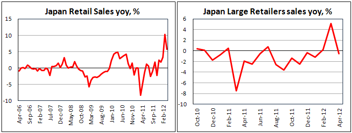 Объем розничной торговли в Японии снизился на 0,3% за апрель 2012 в месячном исчислении, сообщает Министерство экономики, торговли и промышленности. Аналитики прогнозировали рост продаж на 0,1%. В предыдущем месяце индекс сократился на 1,2%.