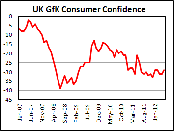 Индикатор потребительской уверенности Великобритании, рассчитанный Gfk, составил -29 пунктов за май 2012 года по сравнению с -31 пунктом в предыдущем месяце. Прогнозировалось снижение показателя до -32 пунктов.