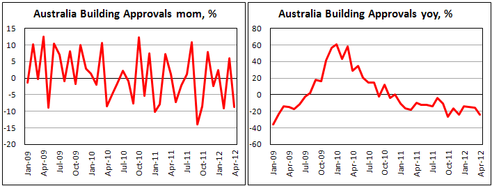 Объем выданных разрешений на строительство снизился за апрель 2012 г. на 8,7%, сообщает Австралийское управление статистики. Прогнозировалось повышение показателя на 0,3%.