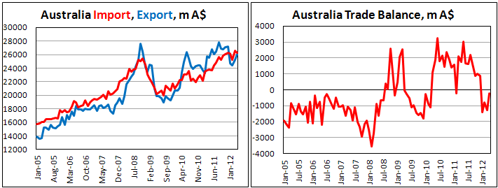 С учетом сезонных факторов дефицит торгового баланса Австралии составил $0,20 млрд. за апрель 2012 г. по сравнению с отрицательным сальдо $1,28 млрд. в предыдущем месяце. Аналитики прогнозировали дефицит на уровне $0,92 млрд.