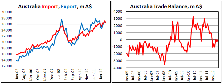 С учетом сезонных факторов профицит торгового баланса Австралии составил $0,01 млрд. за июнь 2012 г. по сравнению с отрицательным сальдо $0,31 млрд. в предыдущем месяце. Аналитики прогнозировали дефицит на уровне $0,36 млрд.