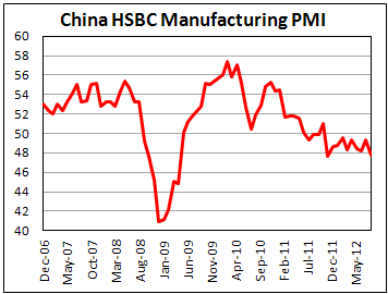 По предварительным данным, индекс PMI для производственной сферы Китая составил 47,8 пункта за август 2012 г. по сравнению с 49,3 пункта месяцем ранее.